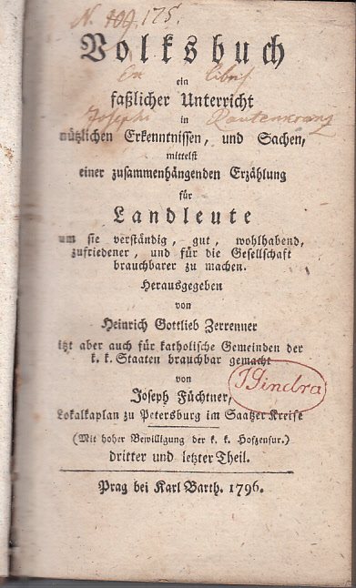 Heinrich Gottlieb ZerrennerVolksbuch ein fasslicher Unterricht in nützlichen Erkenntnissen, und Sachen, mittelst einer zusammenhängenden Erzählung für Landleute um sie verständig, gut, wohlhabend, zusfriedener und für die Gesellschaft brauchbarer zu machenRok vydání: 1796 Nakladatelství:Karl Barth, Prag Počet stran: 258 Vazba: orig. kožená Rozměry: 17 x 10 cm Stav: Na tit. straně vpisky a razítko majitele 2500,-
