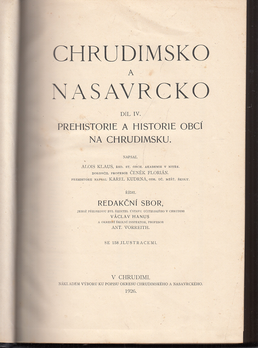 Chrudimsko a Nasavrcko IV. / Prehistorie a historie obcí na ChrudimskuRok vydání: 1926 Nakladatelství:Chrudim Počet stran: 488 Vazba: dobová polokožená Rozměry: 29,5 x 21 cm Stav: Na hřbetu knih. nálepky, na tit. straně stará knih. razítka, vazba ušpiněna 5500,-