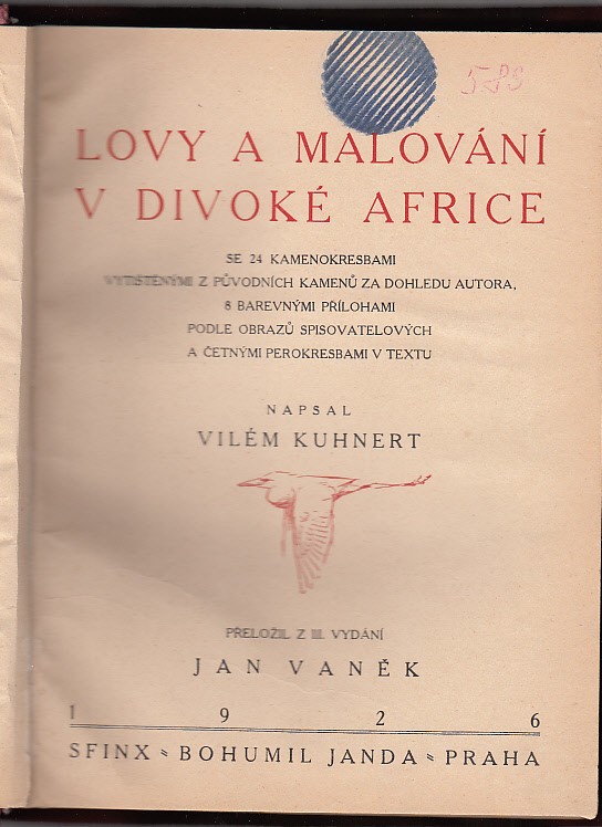 Vilém Kuhnert Lovy a malování v divoké Africe Se 24 kamenokresbami vytištěnými z původních kamenů za dohledu autora, 8 ba.přílohami podle obrazů spisovatelových a četnými perokresbami v textu Rok vydání: 1926 | Nakladatelství: Sfinx | Počet stran: 270 | Vazba: dobová převazba | Rozměry: 25 x 20 cm | Stav: Na tit.straně knih. razítko